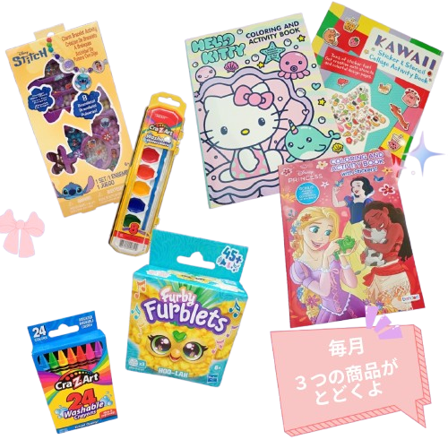 ひみつの 文房具は2点!色鉛筆、クレヨン、シール、ペンなど、何が届くかは開けるまでのお楽しみ!
